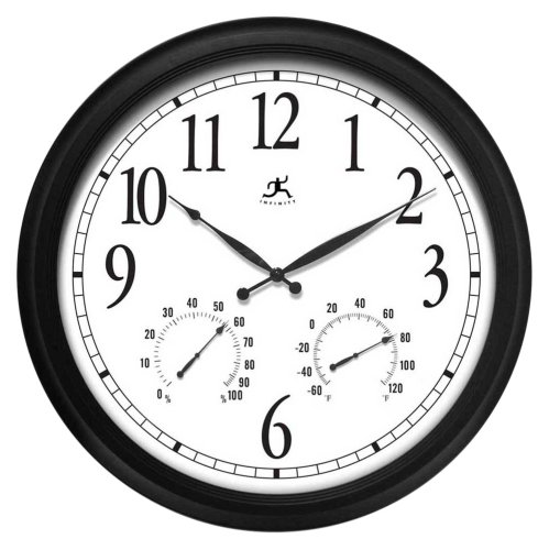 This wall clock is intended for in/outdoor use. The frame is made of metal and finished in a brozed color. The dial is white with Arabic numbers at all hours. The dial also features a thermometer gagde. The hands black and made of metal. Operates by a highly accurate quartz movement and one "AA" battery, not included. Guaranteed by a one year manufacturer's warranty..../ Infinity Instruments The Definitive (Radio Controlled) Wall Clock / Decor Wall Clocks